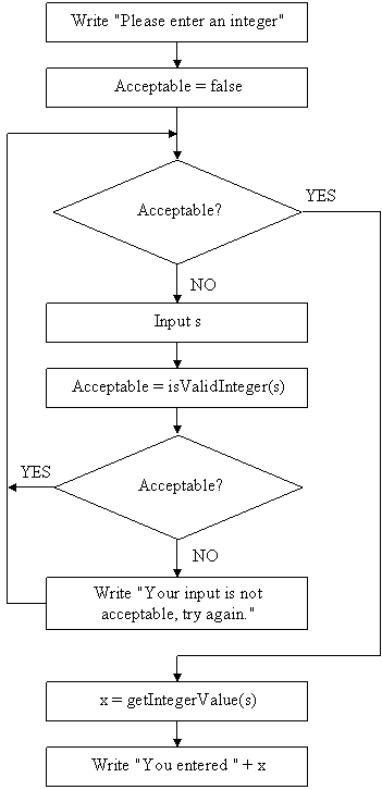 The general strategy here, and in Input Validation B, is to assume any input is invalid until proven valid. Hence we start out by setting Acceptable to false.