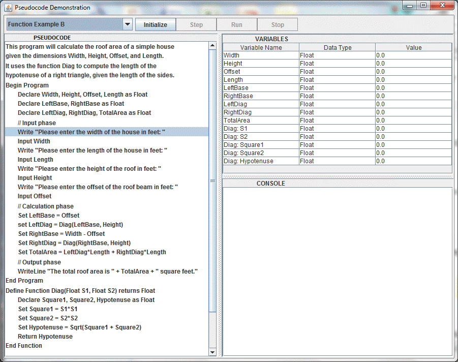 - Function Example B - a more complex use of a function. It computes the roof area of a simple house given the critical dimensions. Click here to read about the problem and the approach to solving it. See Screen Shot!