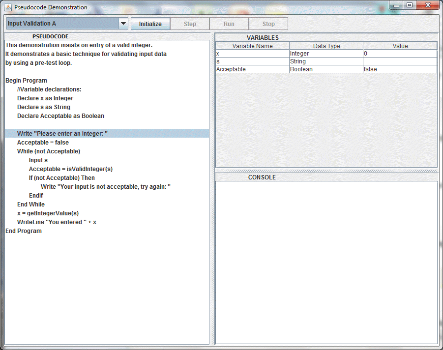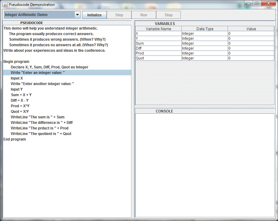 Click Step to execute one line of pseudocode at at time, or
